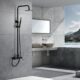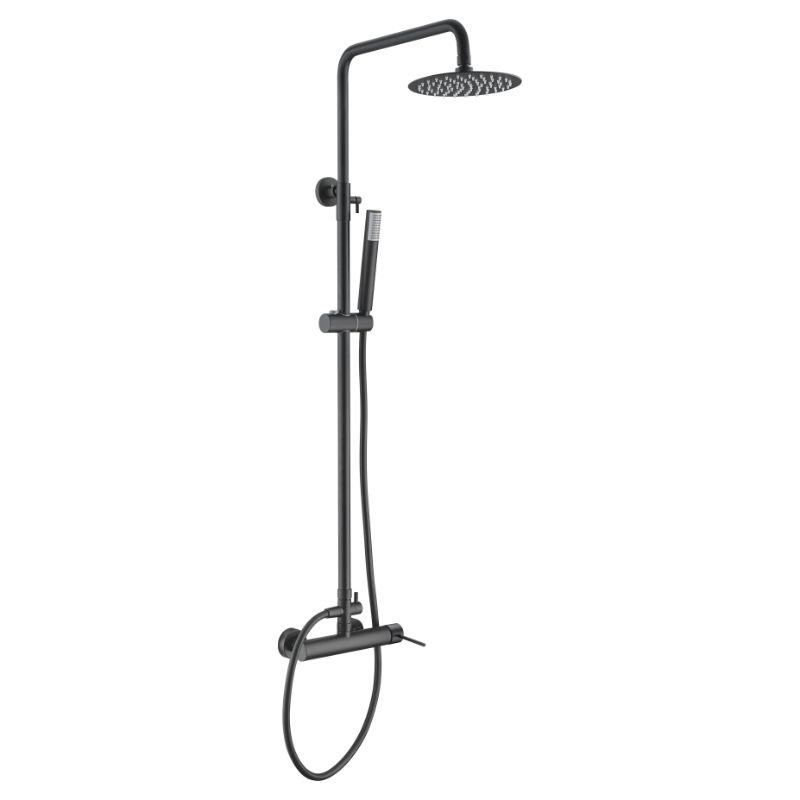 Conjunto de ducha monomando serie MILOS STICK, barra de ducha extensible, cuerpo de la griferia de latón, rociador extraplano Ø20 y antical, cartucho cerámico de 35mm, incluye flexo PVC y mango todo en acabado negro mate.