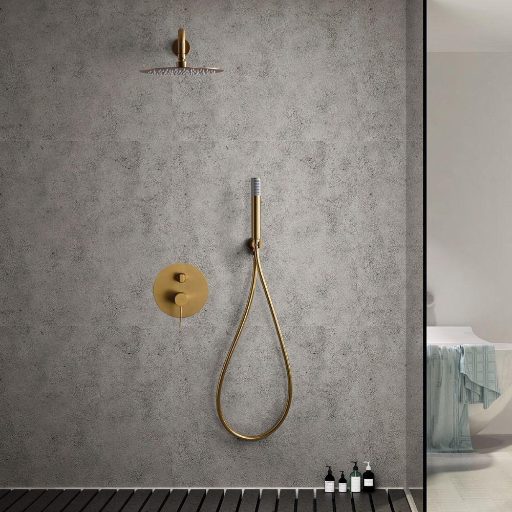 Empotrado de ducha serie LINE en acabado oro cepillado, cuerpo de griferia 2 vías en latón oro cepillado, rociador Ø25, flexo de PVC, cartucho monomando 35mm, salida de agua con flexo y mango y brazo a pared.