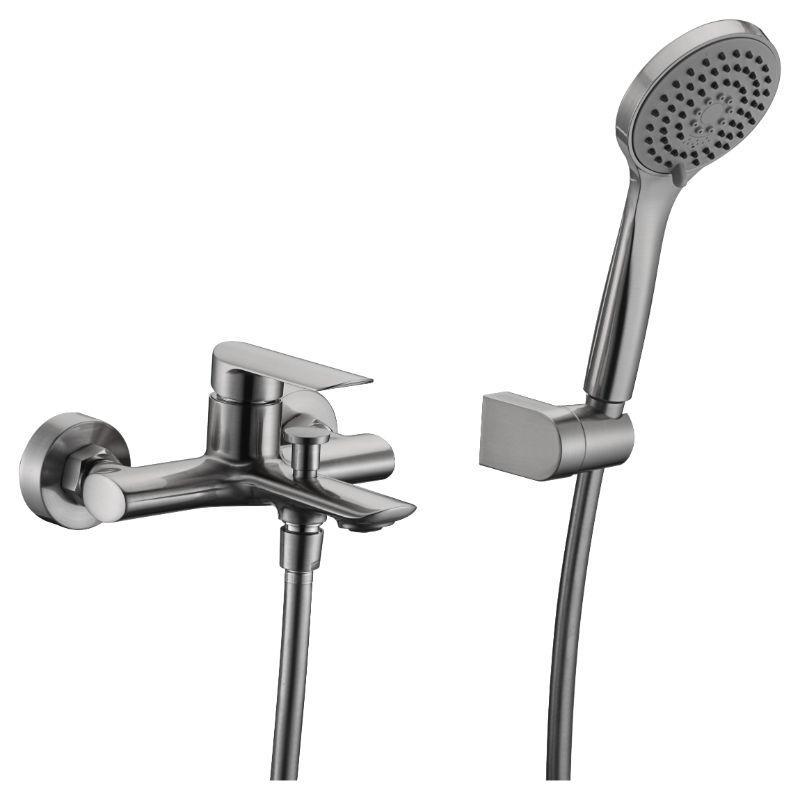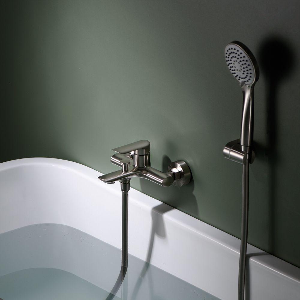 Grifo de baño/ducha serie URAL en acabado níquel cepillado, cuerpo de grifería de latón níquel cepillado, flexo de acero reforzado 170cm, soporte para mango de ducha ABS, mango ducha redondo, cartucho cerámico de 35mm