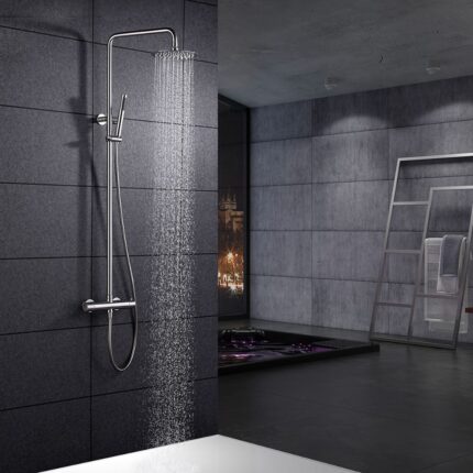 Conjunto de ducha termstático serie MOSCU en acabado acero s.316, barra de ducha extensible en acero s.316, cuerpo de la